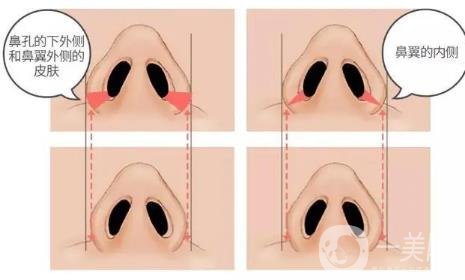 1.如果鼻子太宽或太厚,可以采用:沿鼻翼软骨外侧脚前缘做一个皮肤切口,用小剪刀将皮肤与下面的鼻翼软骨分开,将切口收回,并用小钩将鼻翼软骨全部去除。可以进行切口,切除软骨表面的软组织,并且可以去除软骨的上部和外部。